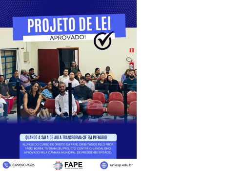 A Faculdade de Presidente Epitácio (FAPE/UNIESP) celebra uma conquista acadêmica e cidadã de grande relevância. O Projeto de Lei contra o vandalismo, elaborado por discentes do curso de Direito sob a orientação do professor Fábio Borini, foi oficialmente aprovado pela Câmara Municipal de Presidente Epitácio no dia 27 de outubro.