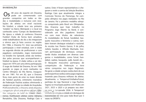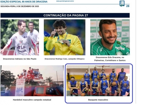 Data: 13/12/2025 | ComentárioO Jornal Regional de Dracena em sua edição comemorativa dos 80 anos da cidade, homenageou o time de basquete Master de Dracena que tem a parceria da Faculdade UNIESP.