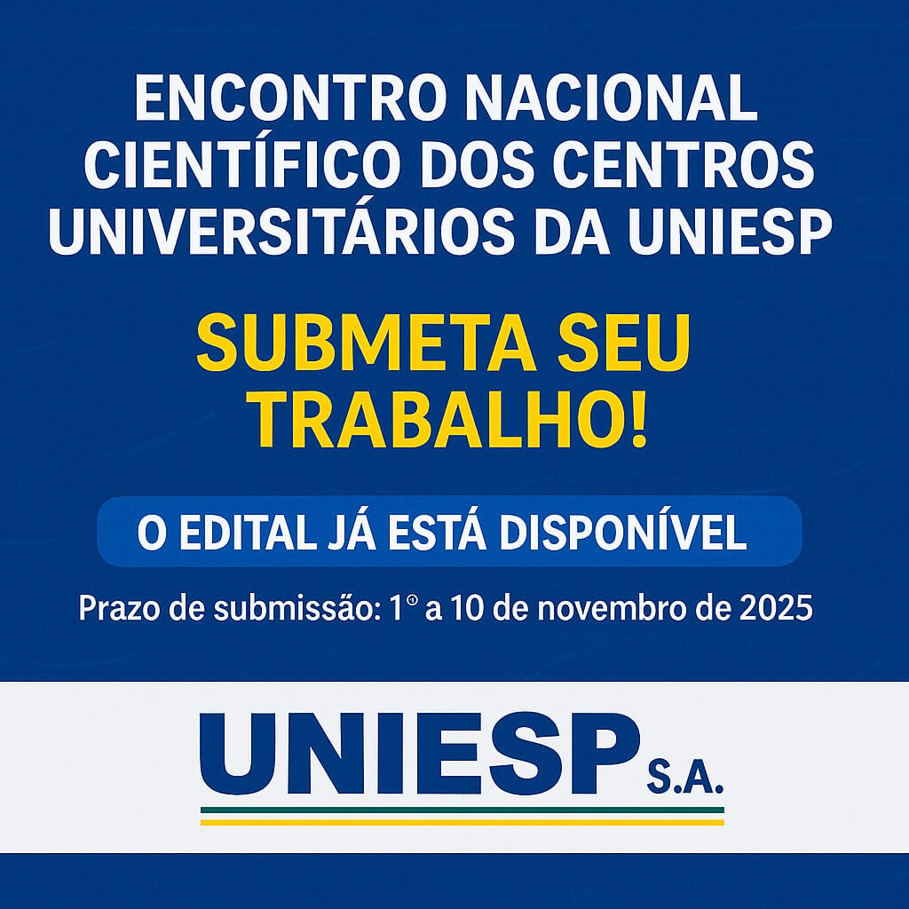 O Encontro Nacional Científico dos Centros Universitários da UNIESP (ENCESP 2025) será realizado de forma online e gratuita nos dias 17, 18 e 19 de novembro de 2025, reunindo docentes, discentes, pesquisadores e extensionistas de todos os Centros Universitários e Faculdades do Grupo UNIESP.