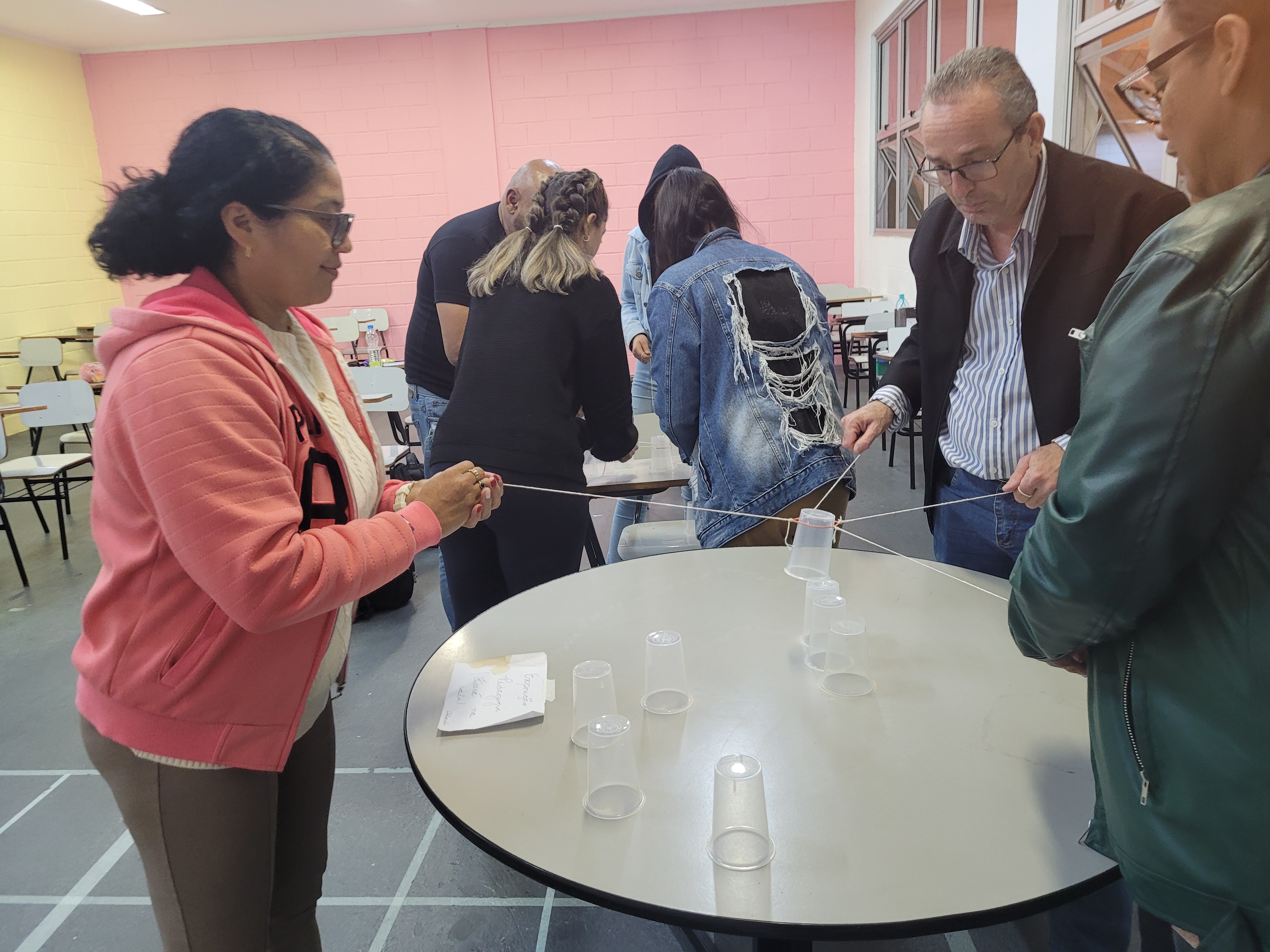 No curso de Pedagogia, os estudantes participaram de um jogo cooperativo em que trabalharam em grupo para construir uma pirâmide utilizando copos plásticos. Cada participante segurava um barbante amarrado a um elástico, e, juntos, precisavam coordenar movimentos para transportar os copos e montar a estrutura sem derrubá-la.