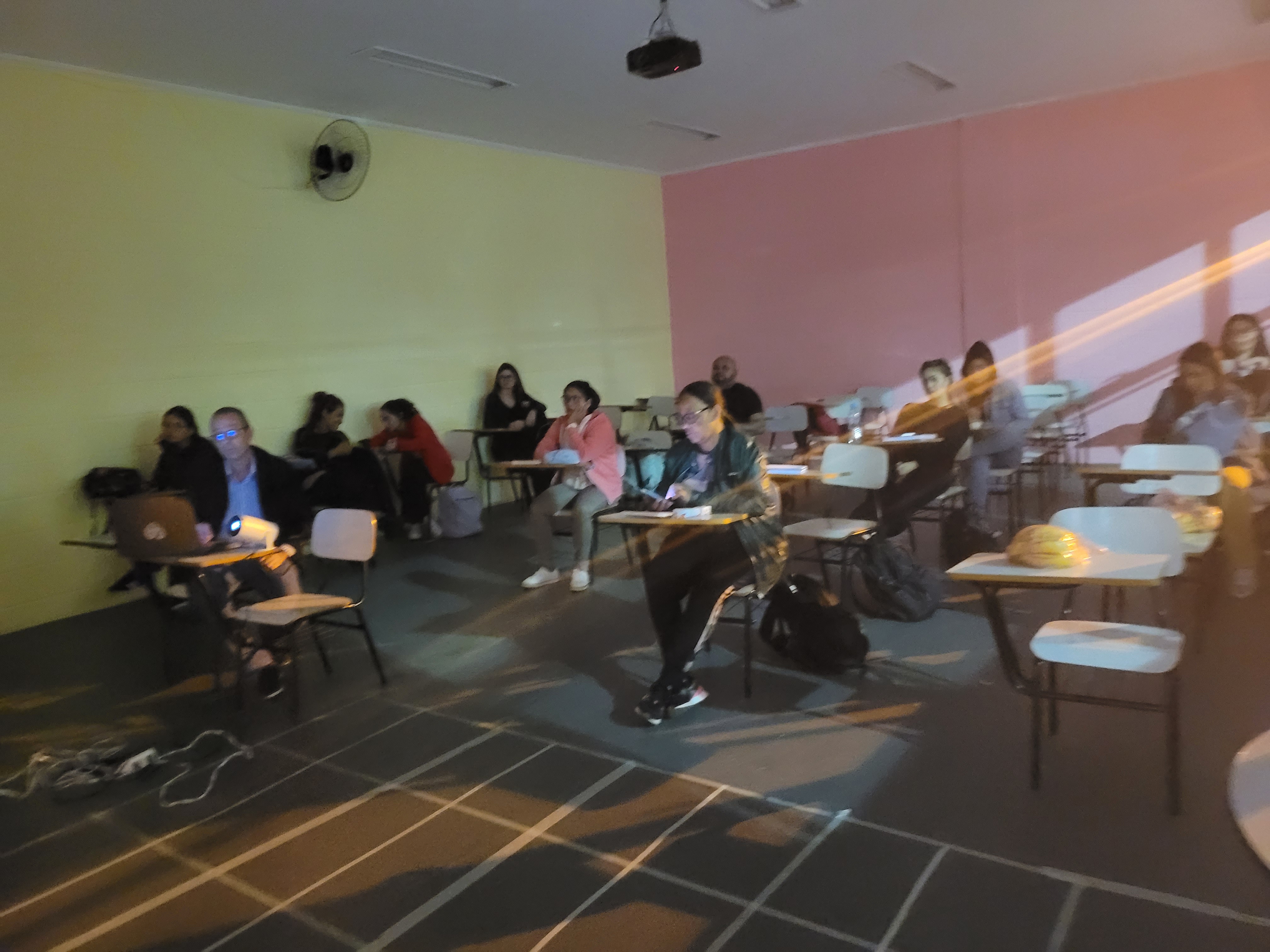 No curso de Pedagogia, os estudantes participaram da atividade telefone-mudo, adaptada para trabalhar comunicação não verbal e gestual, prática bastante utilizada em formações de Libras.